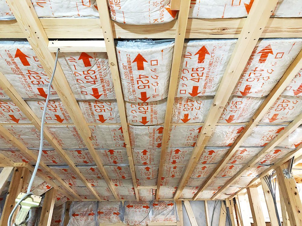 前回スタンバイしていた90㎜厚の断熱材が、壁に天井に屋根裏に床に、ほんとうに隙間なく貼り付けられています。