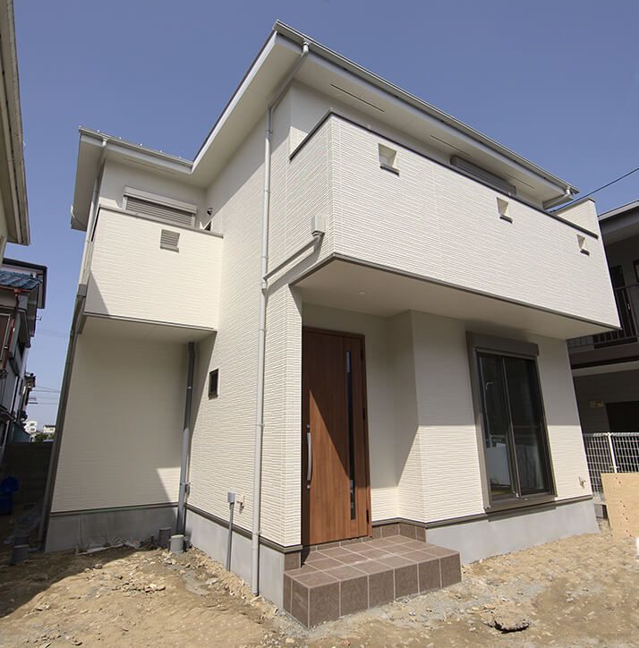 さて、外観は、細い石調の凹凸が美しい外壁とチェリーの玄関ドアが、ナチュラルで落ち着いた雰囲気を醸し出しています。