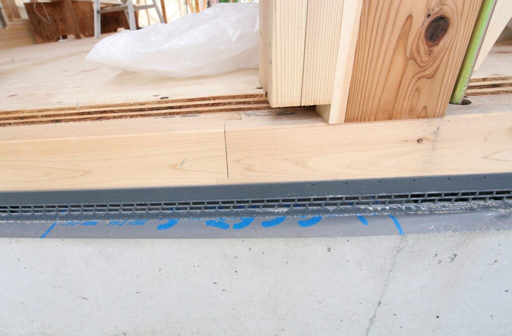 基礎と土台の間に基礎パッキンが入っており、その下にシロアリや害虫に対して忌避効果があるターミダンシートをはさんでいるのが見えますでしょうか?