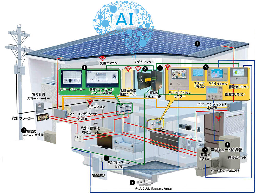 AI搭載クラウドHEMSは、家じゅうのコンセントを集中管理するスマート分電盤の消費電力を常に見張り、いつ、どのタイミングでどの家電設備を稼働したり停止したりするかを制御しています。天気予報を参考に、太陽光発電で作った電気を蓄え、消費をまかないつつ、いつ売れば余った電気を高く売れるかなど、それぞれの家族の暮らし方を学習し続けます。