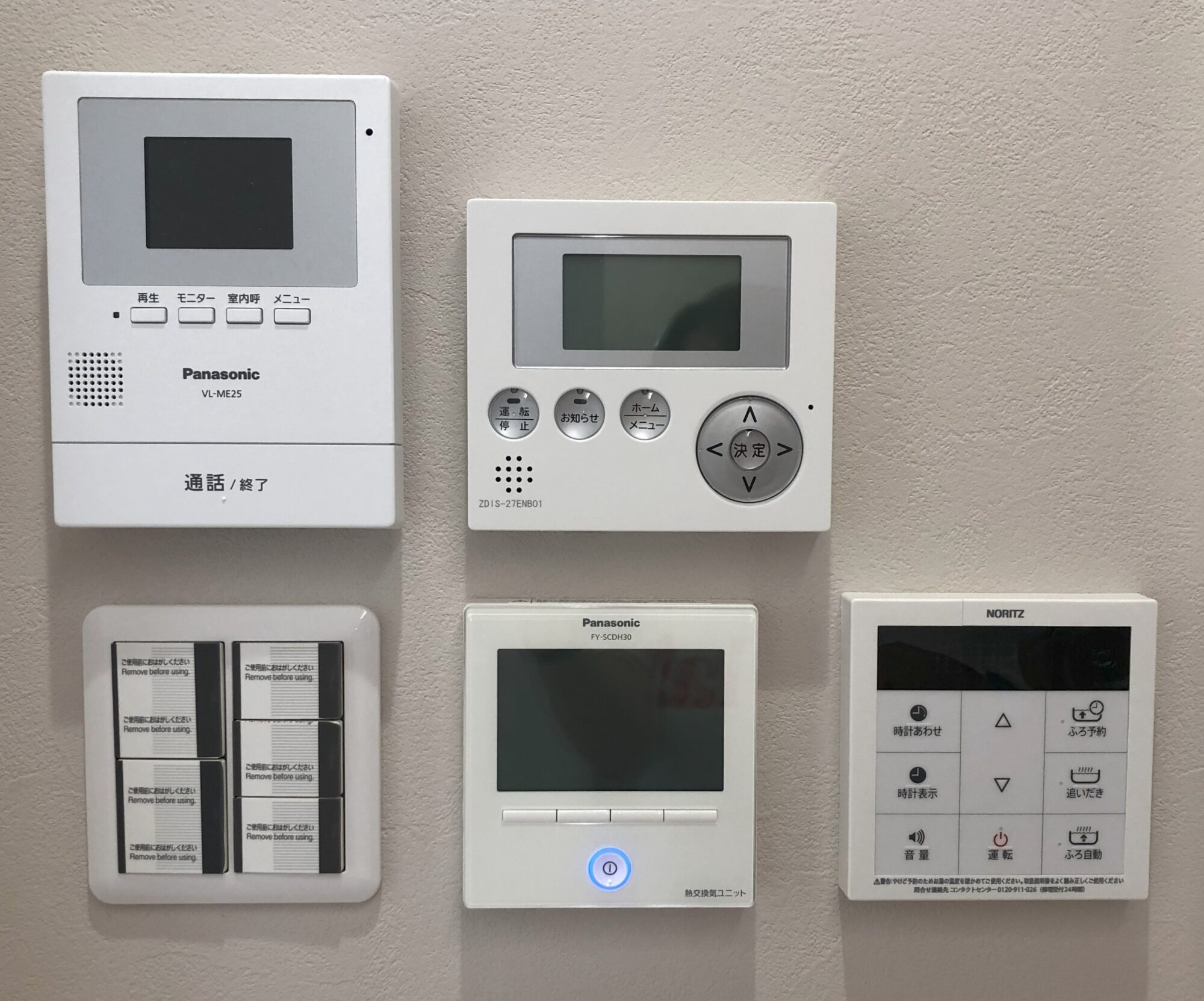 左上から時計回りに、インターフォンのモニター、パワーコンディショナーのリモコン、お風呂のリモコン、熱交換ユニットのリモコン、電灯のスイッチです。ここで家の内外の環境、電気の使用状況などが確認できて、さらにエアコンやシャッター、ロボット掃除機などをスマホやスマートスピーカーで操作できたら、、忙しい共働き家族に大助かりなコクピットの完成です!