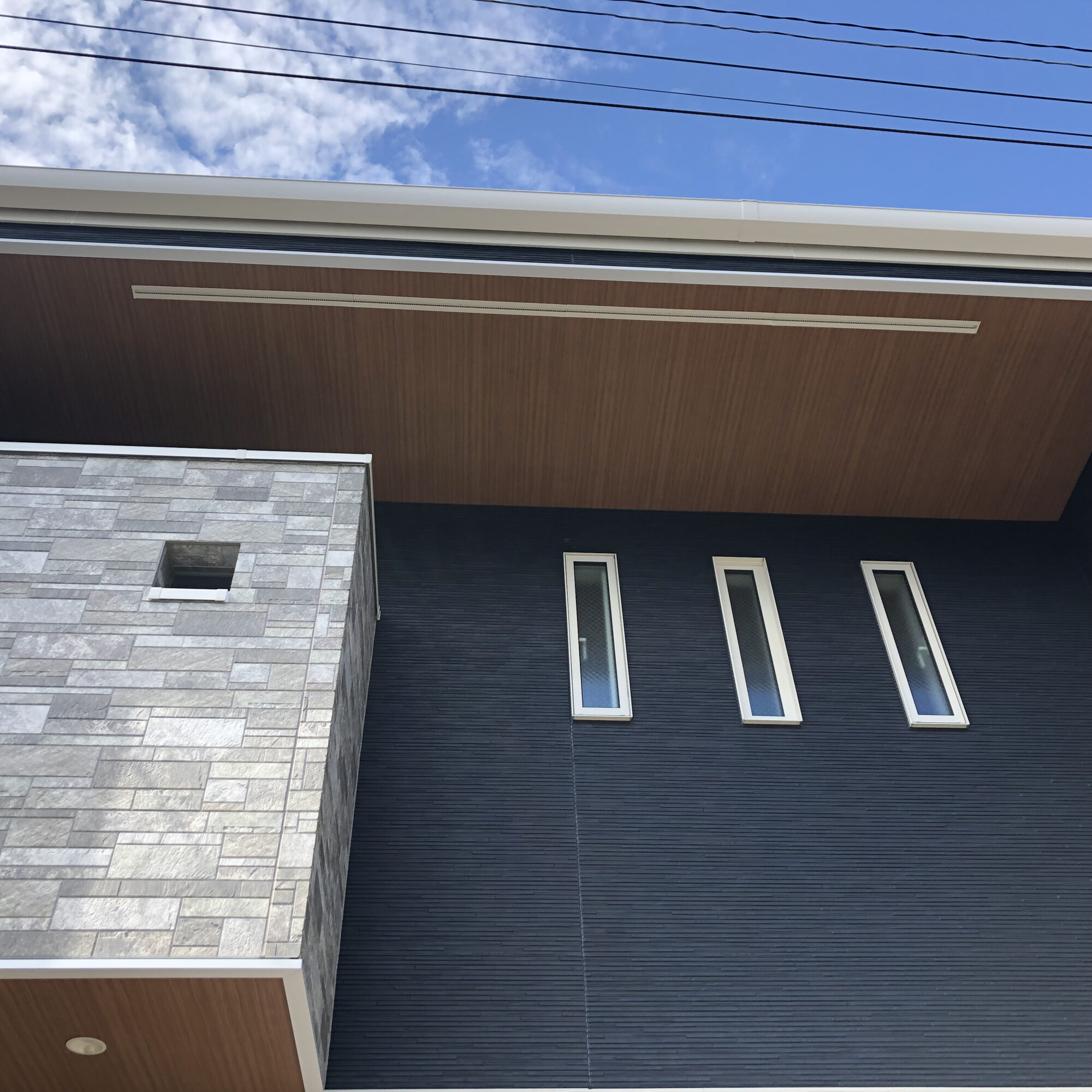 まず外観ですが、張り出した軒が分かりますでしょうか?こちらは南側ですが、軒を大きく前に出すことで、夏の強烈な日差しが壁や家の中に差し込まないよう、日陰を作ります。逆に冬は入射角が低いので、穏やかな日差しが壁や家の中を柔らかく温めてくれます。