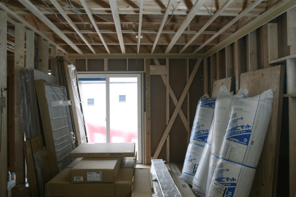 この日は、サイディングの貼り付け中で、建物内は壁が張られる前の状態でした。