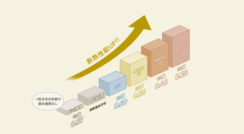 住宅の快適さと省エネ性能を左右する外皮性能(UA値)。私たちは、コスト重視のスタンダード仕様から、断熱性能を高めたハイグレード仕様まで、0.60・0.46・0.26の3つのプランをご用意。ご家族のライフスタイルや将来の光熱費まで見据えた“ちょうどいい”住まいづくりを叶えます。