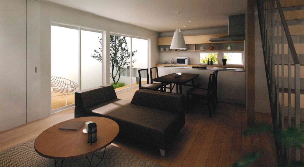 RELAX おしゃれで快適なコートハウス 視線を気にせず味わえる開放感 視線を気にせず味わえる開放感 間取り 特徴 憩いのプライベートガーデン 外からは中庭が見えない箱形のファサード シャープでスッキリとした印象の玄関庇