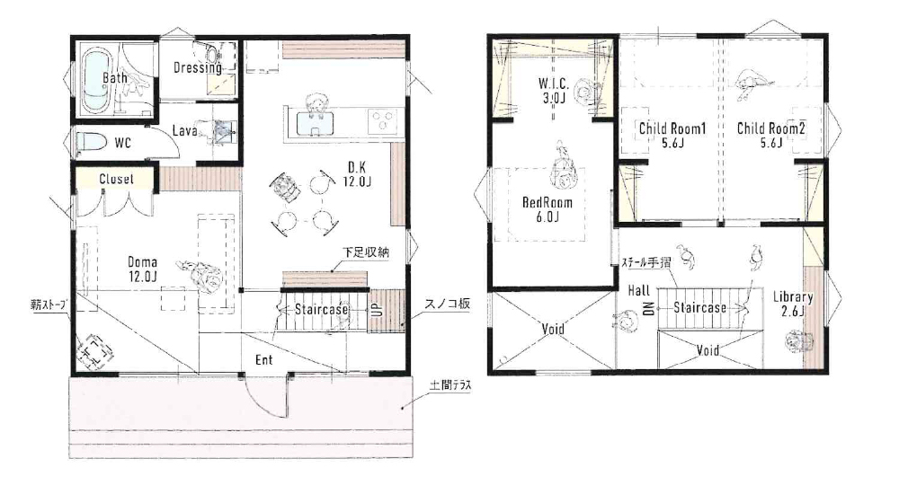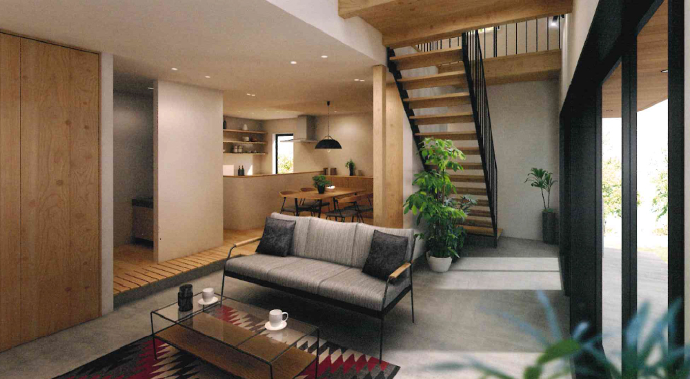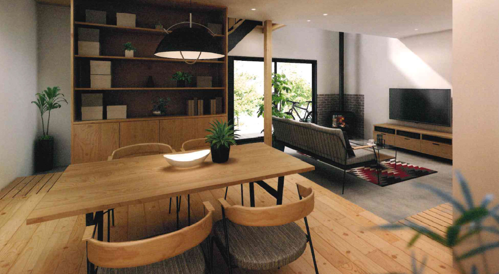 ACTIVE 傷が付きにくく汚れにくいリビング土間 薪ストーブも置ける憧れの空間 薪ストーブも置ける憧れの空間 間取り 特徴 室内空間へ取り入れ多様な用途に使える土間 シャープでモダンな片流れ屋根 ライフスタイルに合わせて変更可能な間取り