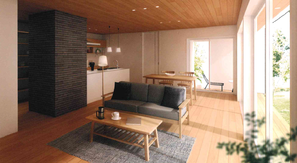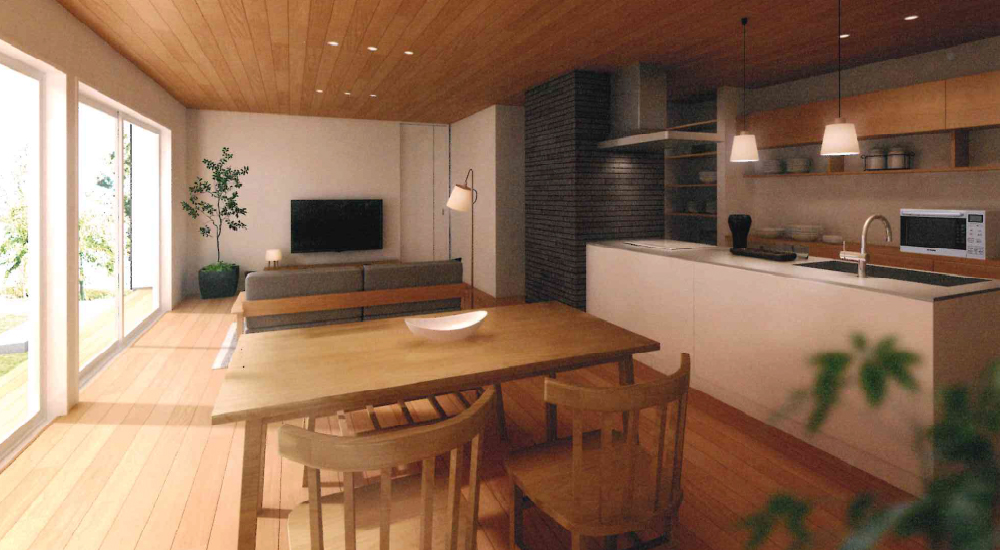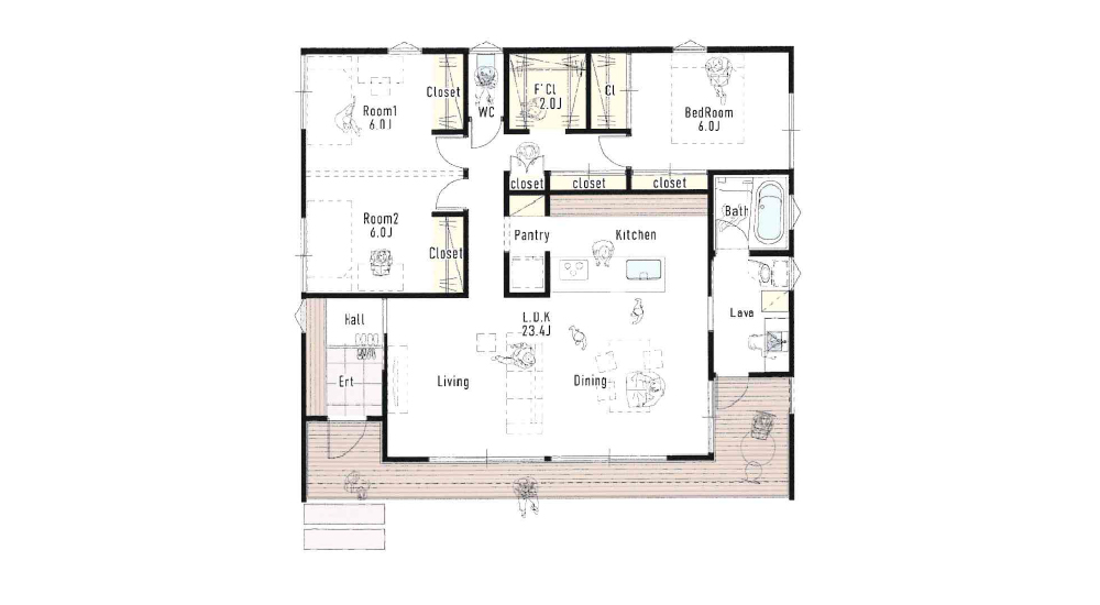 LUXURY 外の景色を取り込む大きな窓の家 絵画のように風景を楽しむ暮らし 絵画のように風景を楽しむ暮らし 間取り 特徴 無駄のない平屋プラン 広々としたワンフロア 玄関ポートとウッドデッキがひと続き