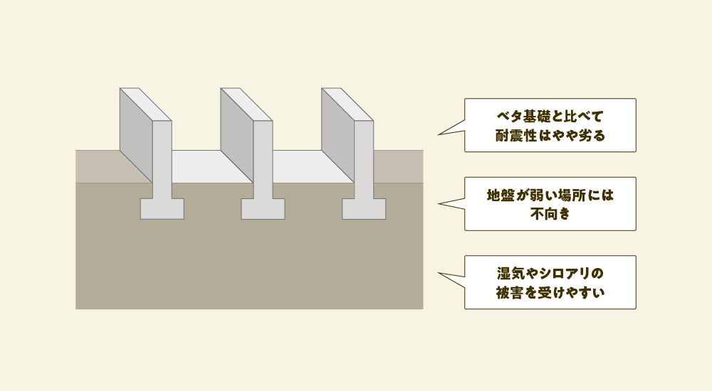 従来の布基礎よりも荷重が広範囲に分散するため、地震や地盤沈下時に破損しにくい。